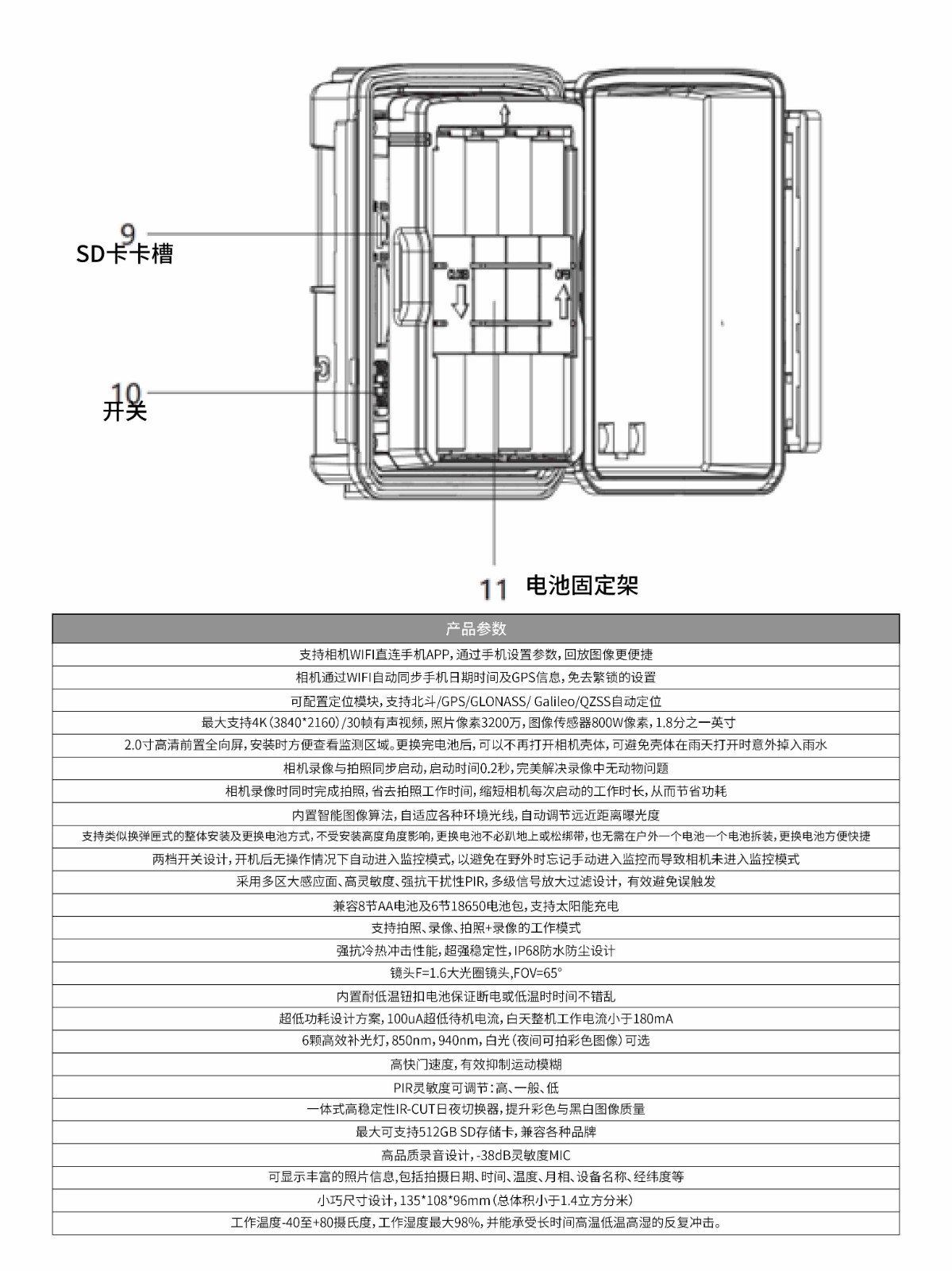 最大支持4K(3840*2160)/30幀有聲視頻,照片像素3200萬,圖像傳感器800W像素,1.8分之一英寸 支持相機Wifi直連手機APP,通過手機設置參數,回放圖像更便捷 相機通過WIFI自動同步手機日期時間及位置信息,免去繁鎖的設置 2.0寸高清前置全向屏,安裝時方便查看監(jiān)測區(qū)域。更換完電池后,可以不再打開相機殼體,可避免殼體在雨天打開時意外掉入雨水